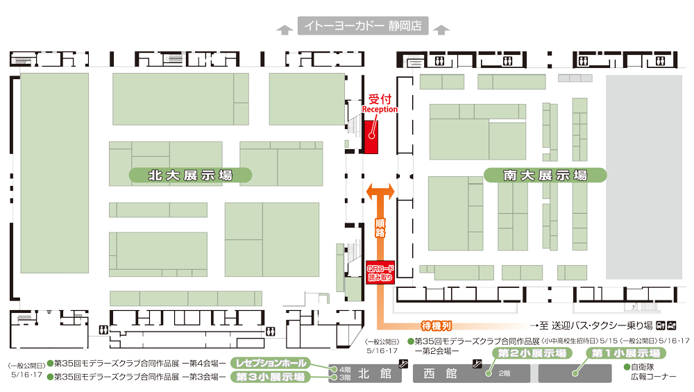 ・入館はツインメッセ静岡プロムナードの「QRコード読み取りコーナー」にてQRコードをご提示、読み取り後に総合受付にて「名札」を受け取り入館いただくの流れとなります。